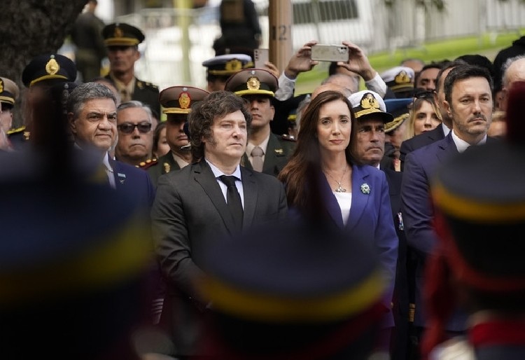 Durante la actividad, que se llevó a cabo en el Cenotafio de la Plaza San Martín y fue transmitido por cadena nacional, estuvo acompañado por la vicepresidenta, Victoria Villarruel, con quien mantuvo algunos cortocircuitos en las últimas semanas