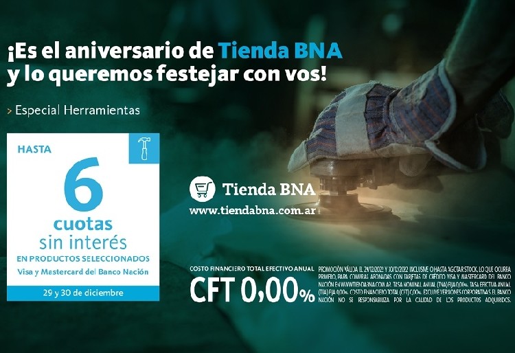 Tienda BNA, el marketplace del Banco Nación (BNA), continúa celebrando su segundo aniversario con una nueva promoción para comprar herramientas manuales y eléctricas en hasta 6 cuotas sin interés los días 29 y 30 de diciembre.