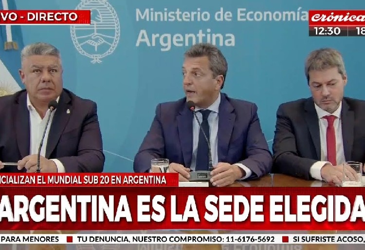 En el mediodía de este lunes, en conferencia de prensa donde estuvieron presente el ministro de Economía Sergio Massa, Matías Lammens, el ministro de Turismo y Deporte y el presidente de la Asociación de Fútbol Argentino (AFA), Claudio “Chiqui” Tapia, se oficializó la firma de los avales para el Mundial Sub 20.