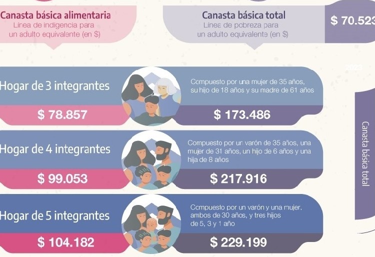 En el caso de tres integrantes estos valores se ubicaron en los $173.486 y si fuesen cinco integrantes, $229.199. Estas mediciones se incrementaron un 118,6% de forma anual. El CBA índice mide el umbral de la pobreza, por lo tanto un adulto necesitó en marzo $70.523 para no ser considerado pobre.