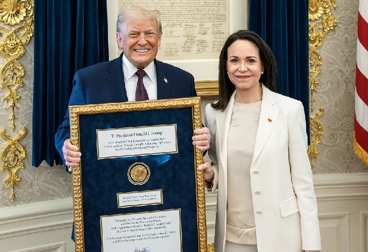 La fundadora del partido Vente Venezuela utilizó un marco con detalles dorados para presentar la medalla, que obsequió al mandatario en la Casa Blanca. En la parte superior del marco escribió: “en gratitud por su extraordinario liderazgo para promover la paz”, y añadió que el gesto representa un reconocimiento del pueblo venezolano por las acciones de Trump para encaminar “su libertad”.