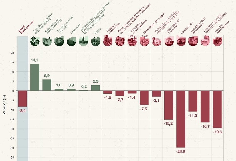 Nueve sectores de actividad registraron caídas en la comparación interanual, entre los que se destacan Construcción (-29,9%) e Industria manufacturera (-19,6%). Junto con Comercio mayorista, minorista y reparaciones (-16,7%) aportan 6,6 puntos porcentuales a la caída interanual del EMAE.