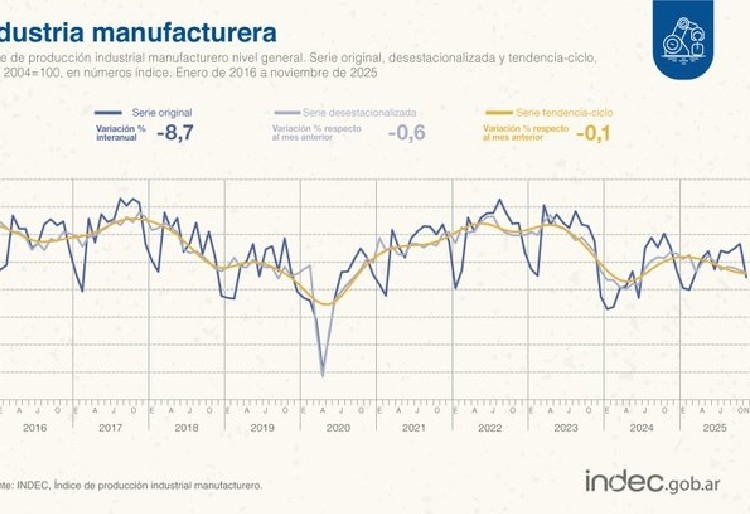 El INDEC informó este jueves que el Índice de Producción Industrial (IPI) se contrajo 0,6% respecto de octubre. De este modo, la serie sin estacionalidad del organismo registró su peor dato desde junio de 2024.