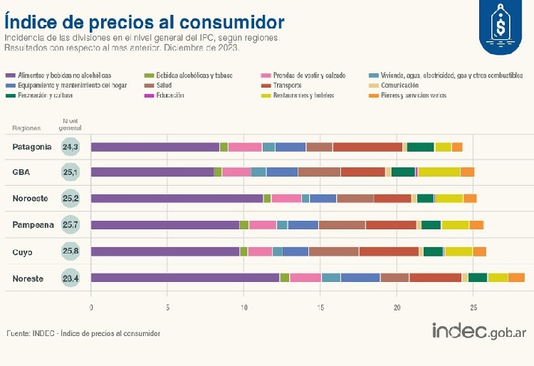 Sin embargo, la división con mayor incidencia en todas las regiones fue Alimentos y bebidas no alcohólicas, con un incremento del 29,7%, preciso el Indec, impulsada por los precios de la Carne y derivados, y de Pan y cereales.