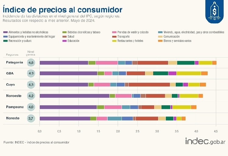 La división con mayor incidencia en todas las regiones fue Alimentos y bebidas no alcohólicas (4,8%), donde se destacaron los aumentos de Verduras, tubérculos y legumbres; Leche, productos lácteos y huevos; y Aceites, grasas y manteca.