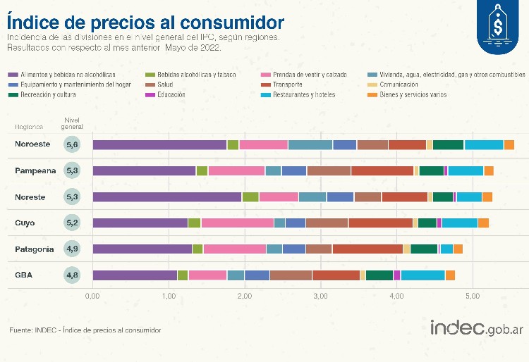 En ese sentido, los incrementos que tuvieron mayor incidencia fueron en carne, leche, huevos, pan y cereales. También, aceites, grasas y manteca. Al igual que azúcar, dulces, chocolate y golosinas. Por su parte, café, té, yerba y cacao y aguas minerales, bebidas gaseosas y jugos fueron los de mayor alza. Mientras que verduras, tubérculos y legumbres mostraron bajas en la mayoría de las regiones.