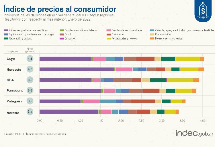 Asimismo, destacó que “las dos divisiones de menor variación en enero fueron ‘Educación’ (0,8%) y ‘Vivienda, agua, electricidad y otros combustibles’ (1,8%)”, mientras que “la suba de ‘Alimentos y bebidas no alcohólicas’ (4,9%) fue la de mayor incidencia en todas las regiones”.