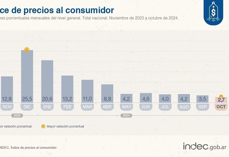 La inflación descendió a 2,7% en octubre, de acuerdo a lo informado por el Instituto Nacional de Estadística y Censos (INDEC). Al mismo tiempo, los precios minoristas acumularon una suba de 107% en los primeros diez meses de 2024 mientras que la variación interanual se redujo a 193%.