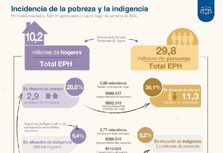 La pobreza alcanzó al 38,1% de las personas y al 28,6% de los hogares en el segundo semestre de 2024, según la Encuesta Permanente de Hogares en 31 aglomerados urbanos publicada hoy por el Indec.