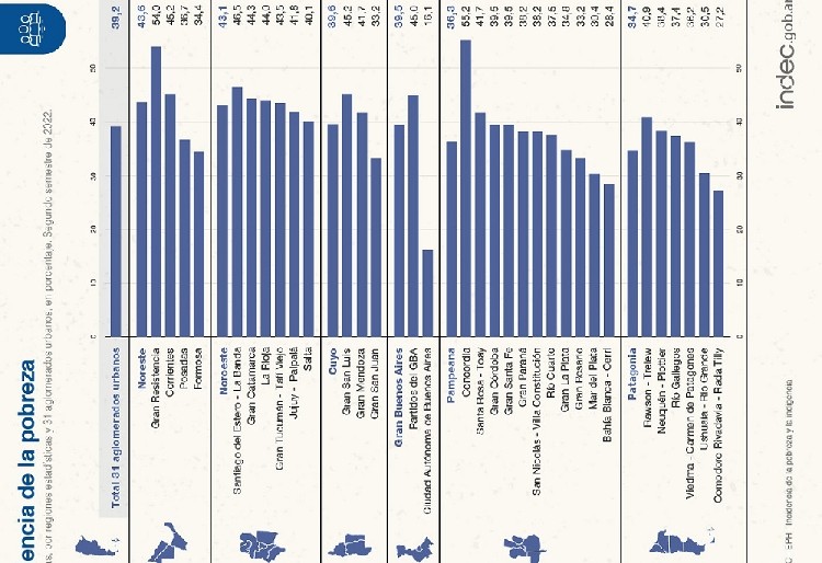 El Instituto Nacional de Estadística y Censos reportó que la pobreza en el segundo semestre del año 2022 alcanzó al 39,2 % de la población argentina. Cómo se refleja el dato en las regiones.