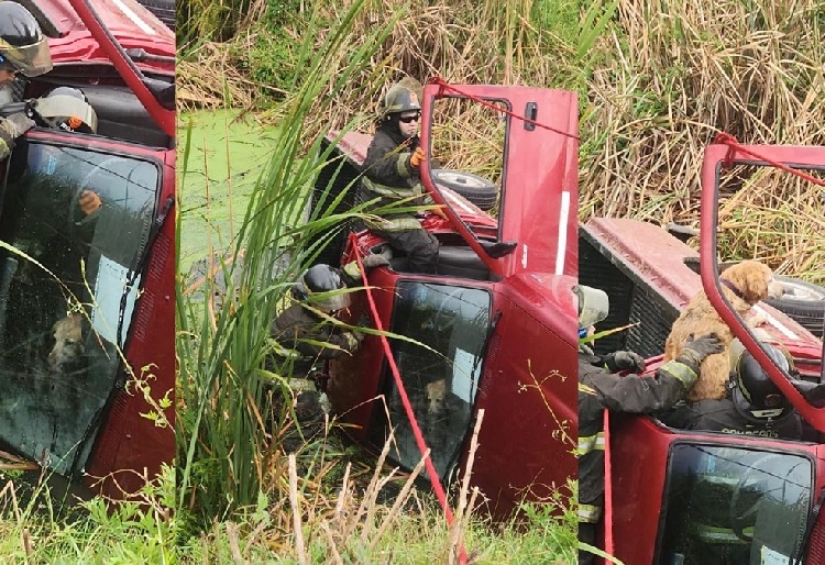 Bomberos del Cuartel Oeste intervinieron en el kilómetro 303 de la autopista para liberar a un animal que había quedado dentro de un vehículo volcado y parcialmente sumergido en un canal de agua.