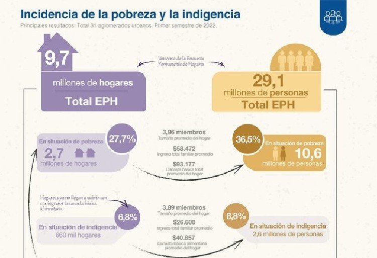 El Instituto Nacional de Estadística y Censos (INDEC) dio a conocer el índice de Pobreza e Indigencia correspondiente al primer semestre del año que, se ubicó en 36,5% al cierre del primer semestre del 2022, eso es equivalente a 16,5 millones de personas. Por su parte, la indigencia se ubicó en 8,8%, que representa a 4 millones de personas.