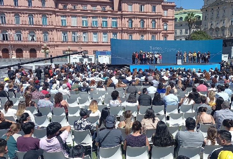 Alberto Fernández celebró este miércoles sus tres años de gestión como presidente de la Nación en el Parque Colón, ubicado en la parte posterior de la Casa Rosada. Como único orador y sin la presencia de sus dos socios en la cúpula del Frente de Todos: la vicepresidenta Cristina Kirchner y el ministro de Economía, Sergio Massa, realizó un repaso por las políticas públicas implementadas a lo largo de estos 36 meses. También –entre críticas a la oposición, a los medios y a quienes cuestionan su liderazgo– intentó posicionarse como quien tomará el mando de la coalición oficialista de cara a las próximas elecciones.
